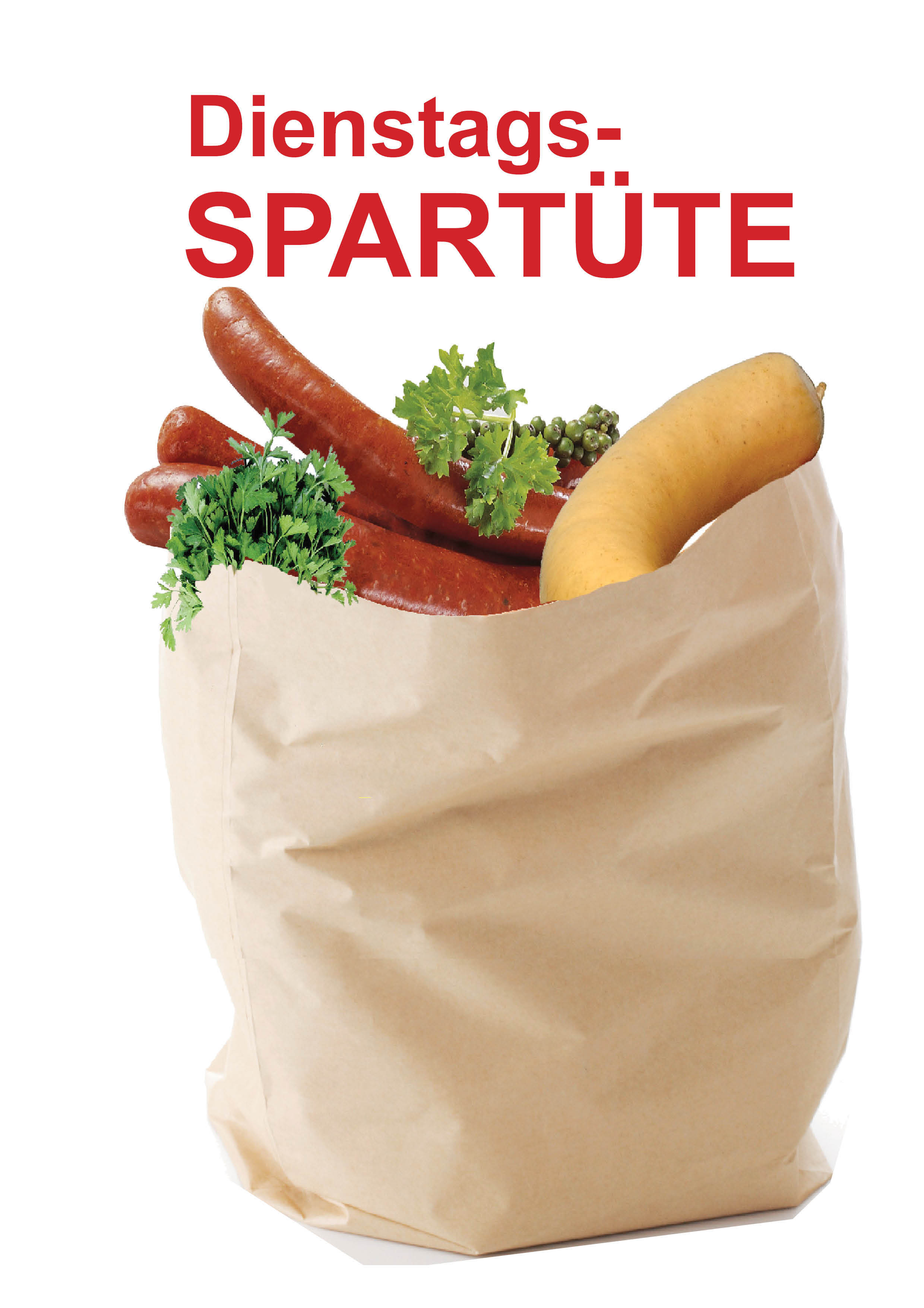 Jeden Dienstag erhalten Sie unsere Spartüte mit wechselndem Inhalt, aus unserer eigenen Herstellung, zum Sonderpreis von nur 3,50 € Immer solange Vorrat reicht, ab drei Stück bitte nach Möglichkeit vorbestellen! Abgabe nur in Haushaltsüblicher Menge.